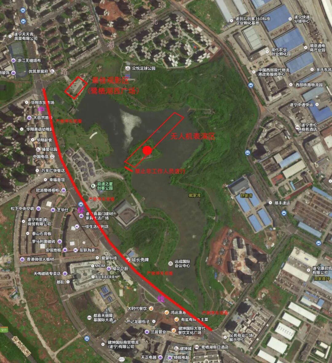 10月5日至6日,光影秀迎来“中秋团圆”主题收官站,落地鹭栖湖体育公园,每日20:00-20:15与市民见面。龙、圆月、月饼、仙鹤、蝴蝶等充满中秋意蕴的元素将点亮夜空,适配全家老小共同观赏,在温馨光影中传递团圆温暖,同时也将融入遂宁高新区的未来发展图景。最佳观赏点为鹭栖湖西北广场(北湖路段),300米内视角最佳;健坤华翔城、融创、华翔・望江山等周边小区居民,在家门口即可坐享这场中秋光影盛宴。