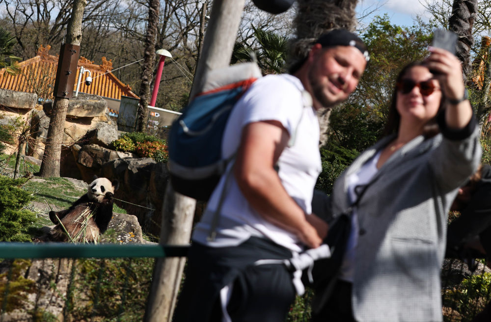 ↑3月22日,在法国圣艾尼昂的博瓦勒野生动物园,游客与大熊猫“欢欢”自拍留念。