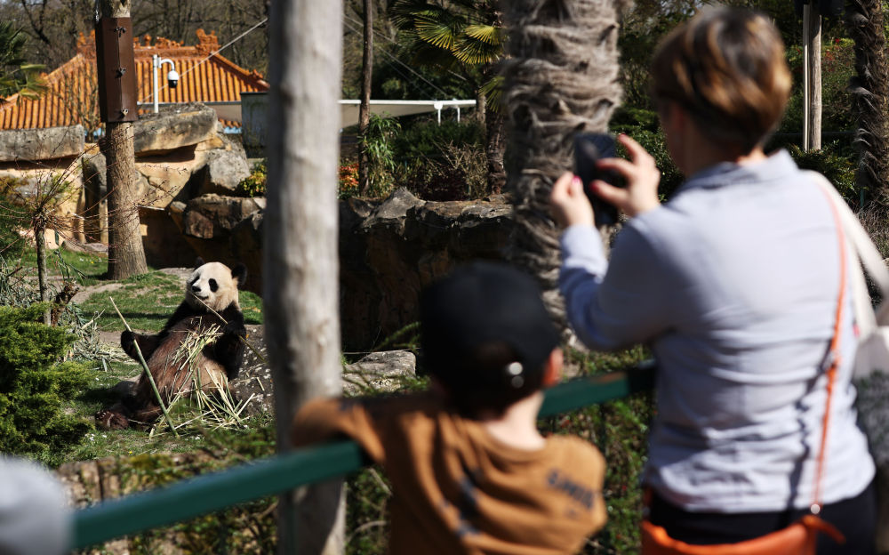 ↑3月22日,在法国圣艾尼昂的博瓦勒野生动物园,游客看望大熊猫“欢欢”。