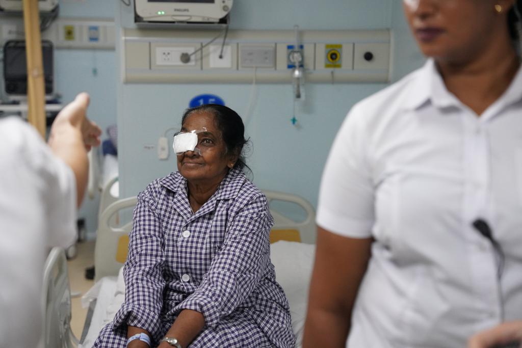 这是2024年12月24日在斯里兰卡科伦坡港停靠的中国海军“和平方舟”号医院船上拍摄的刚进行完白内障手术的本地患者。(新华社记者伍岳摄)
