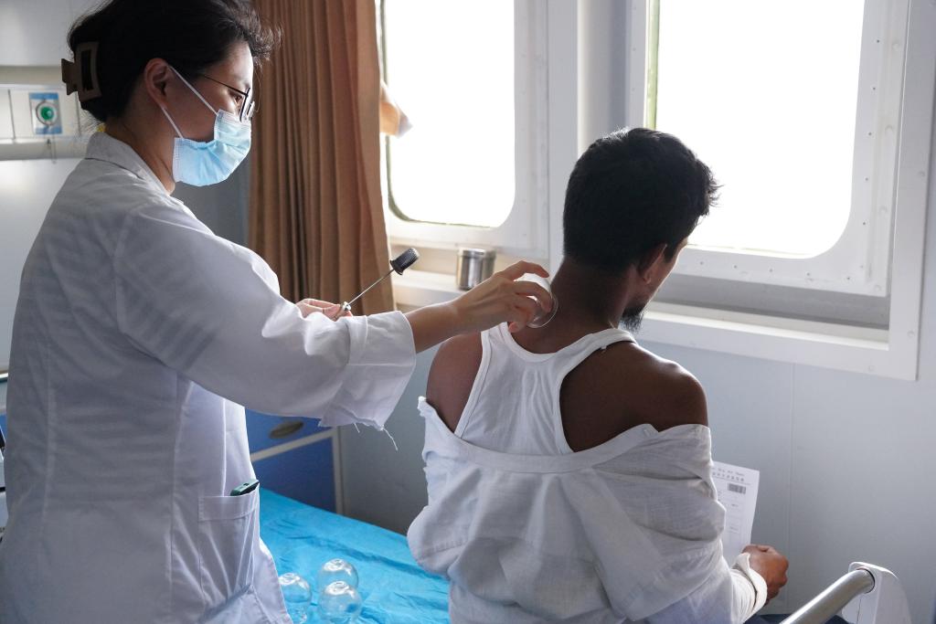 2024年12月24日,在斯里兰卡科伦坡港,中国海军“和平方舟”号医院船上的医生为19岁的小伙穆贾希德拔火罐。(新华社记者伍岳摄)