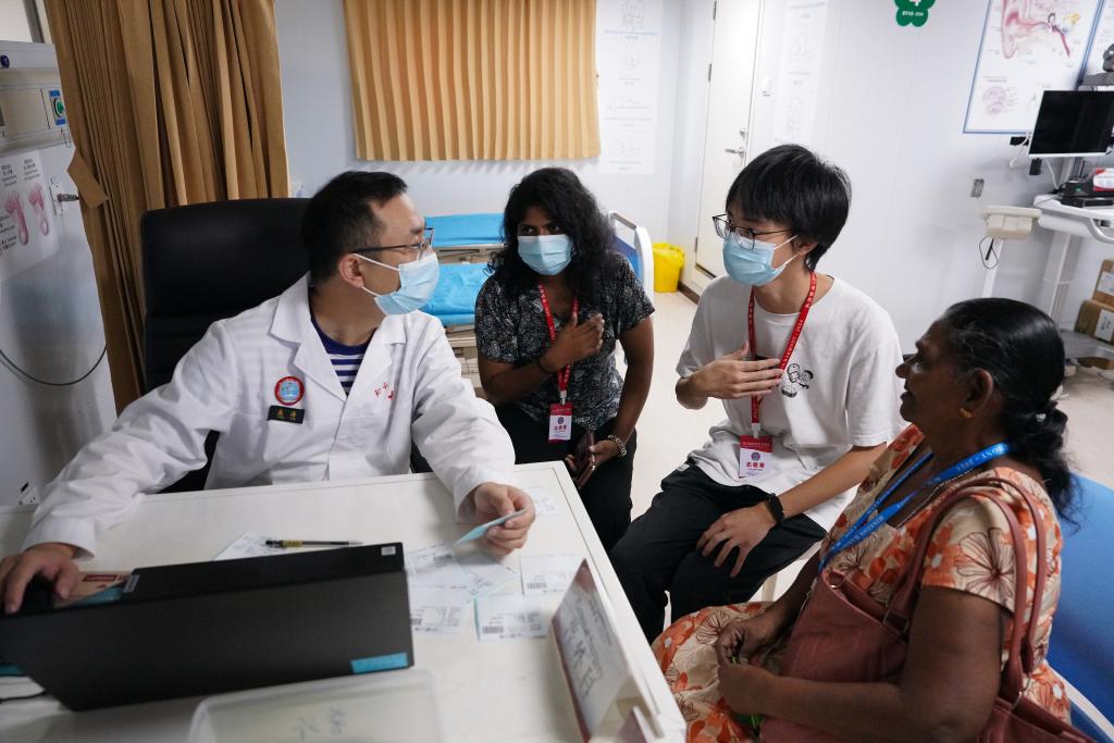 2024年12月24日,在斯里兰卡科伦坡港,中国海军“和平方舟”号医院船上的医生在志愿者的帮助下对当地患者进行问诊。(新华社记者伍岳摄)