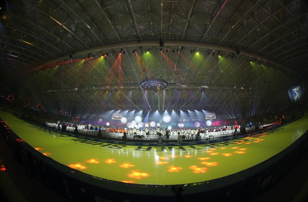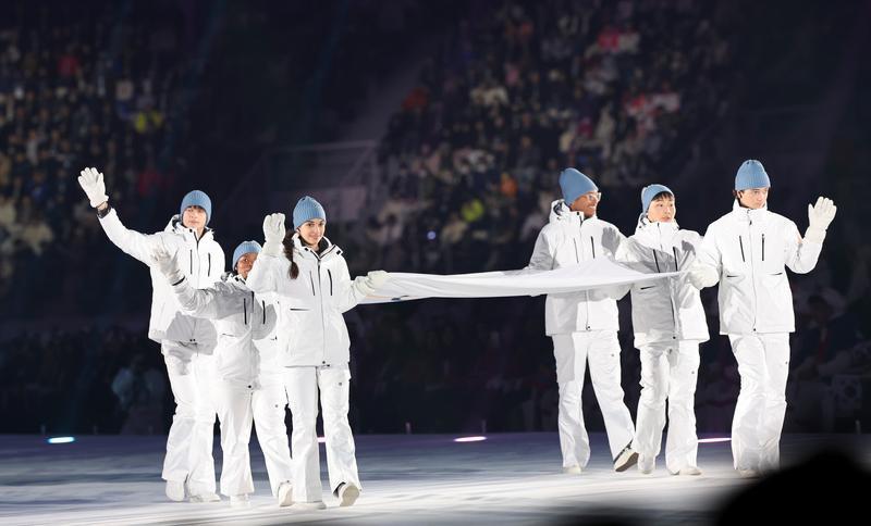 颇具设计感的是,开幕式同时在江陵速滑馆和平昌圆顶体育馆举行。平昌是2018年冬奥会的举办城市,代表着冬季运动的历史,江陵则象征着冬季运动的未来。当六名韩国运动员在江陵主舞台手持东道主国旗入场时,在位于平昌的副舞台,六名当地居民也在同一时间入场——冬季运动的过去和未来在此刻交汇。