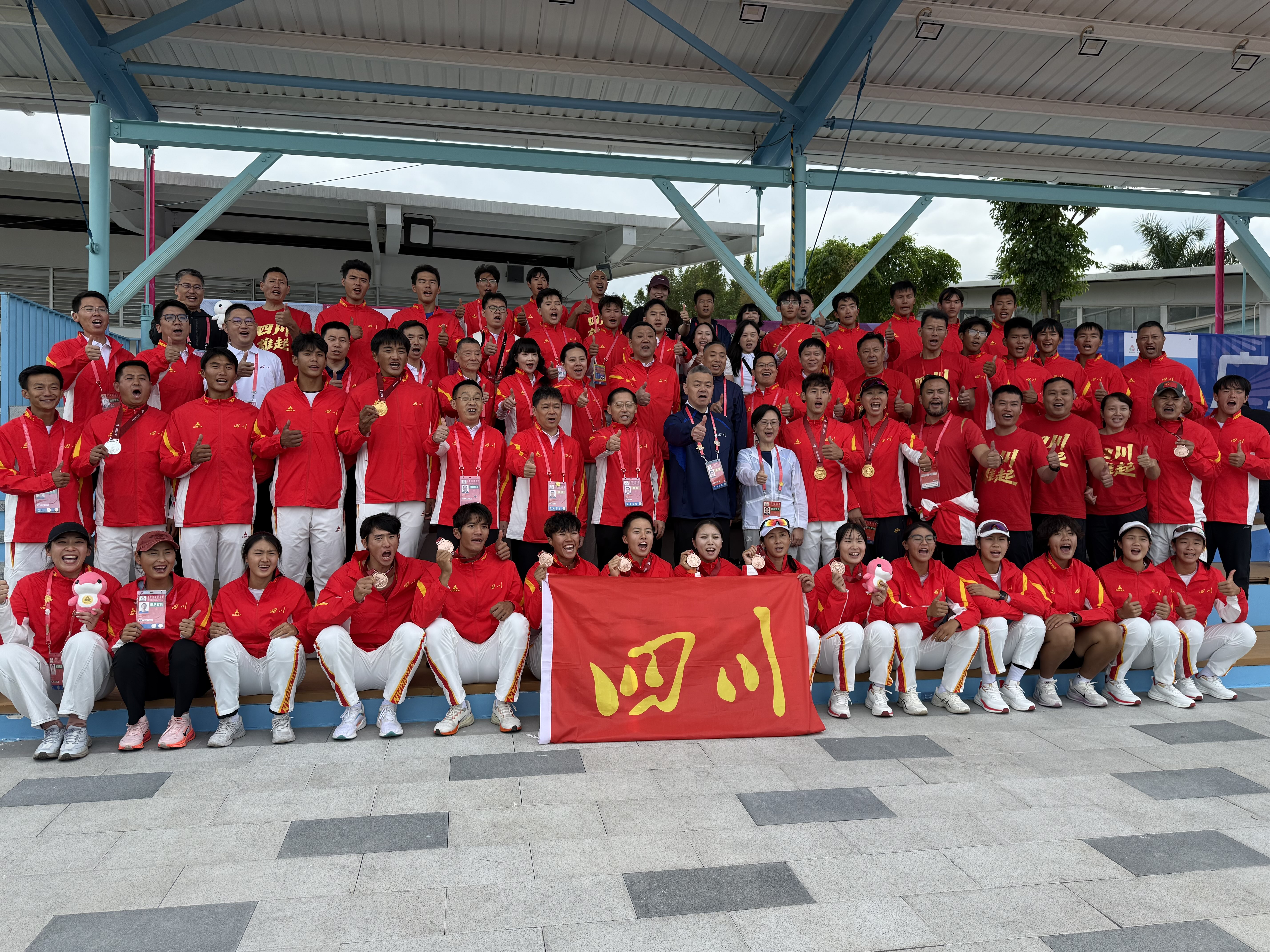 结束了本届全运会所有比赛后,四川赛艇队拍了一个大合照,每个人脸上都洋溢着开心和兴奋,他们在本届全运会收获了两金一银两铜,此外还有四个前八名的好成绩。此前,小轮车队已获得男子自由式公园赛一金一银,截至11月11日,四川省水上运动管理中心已获三金两银两铜。
