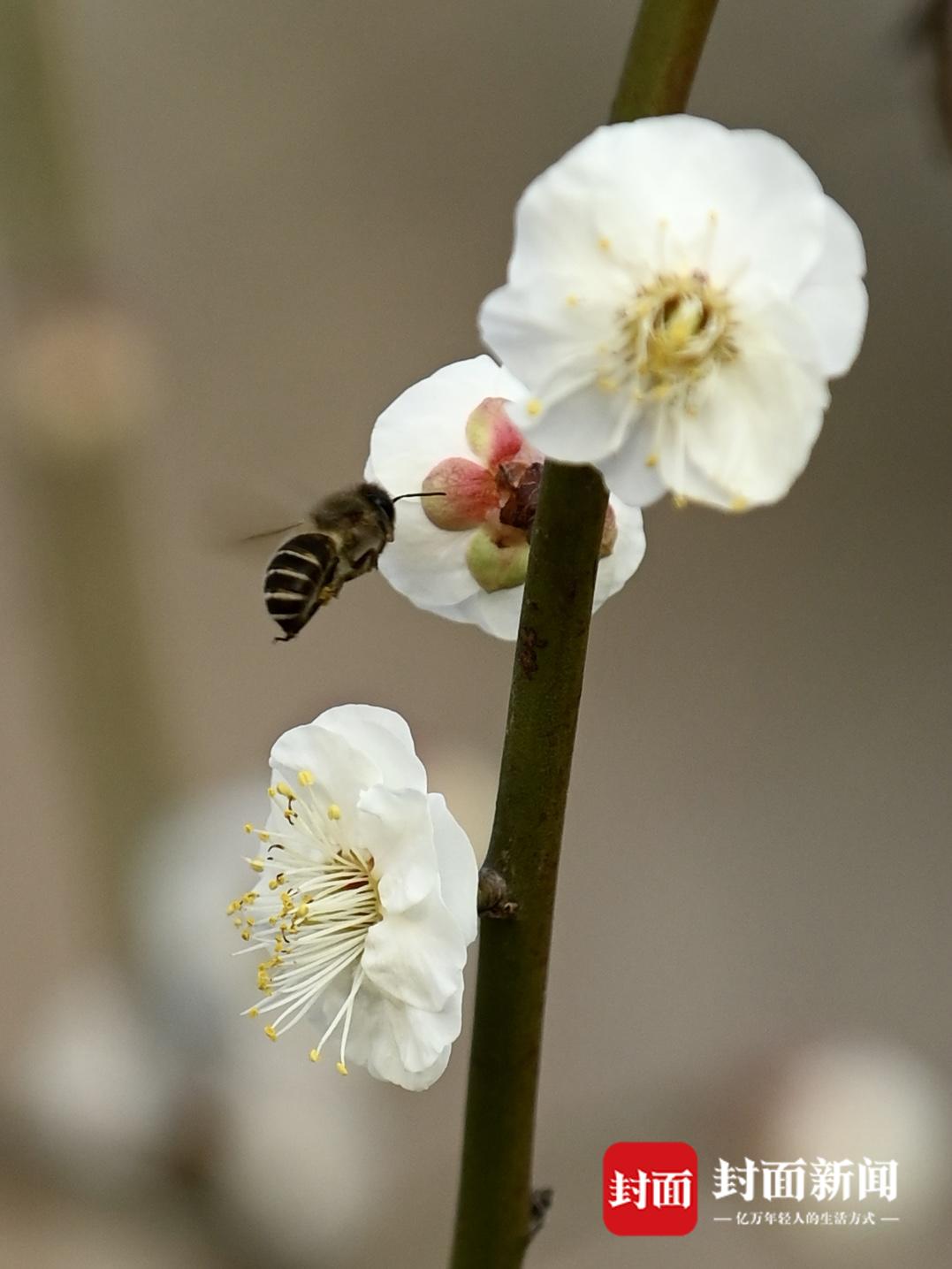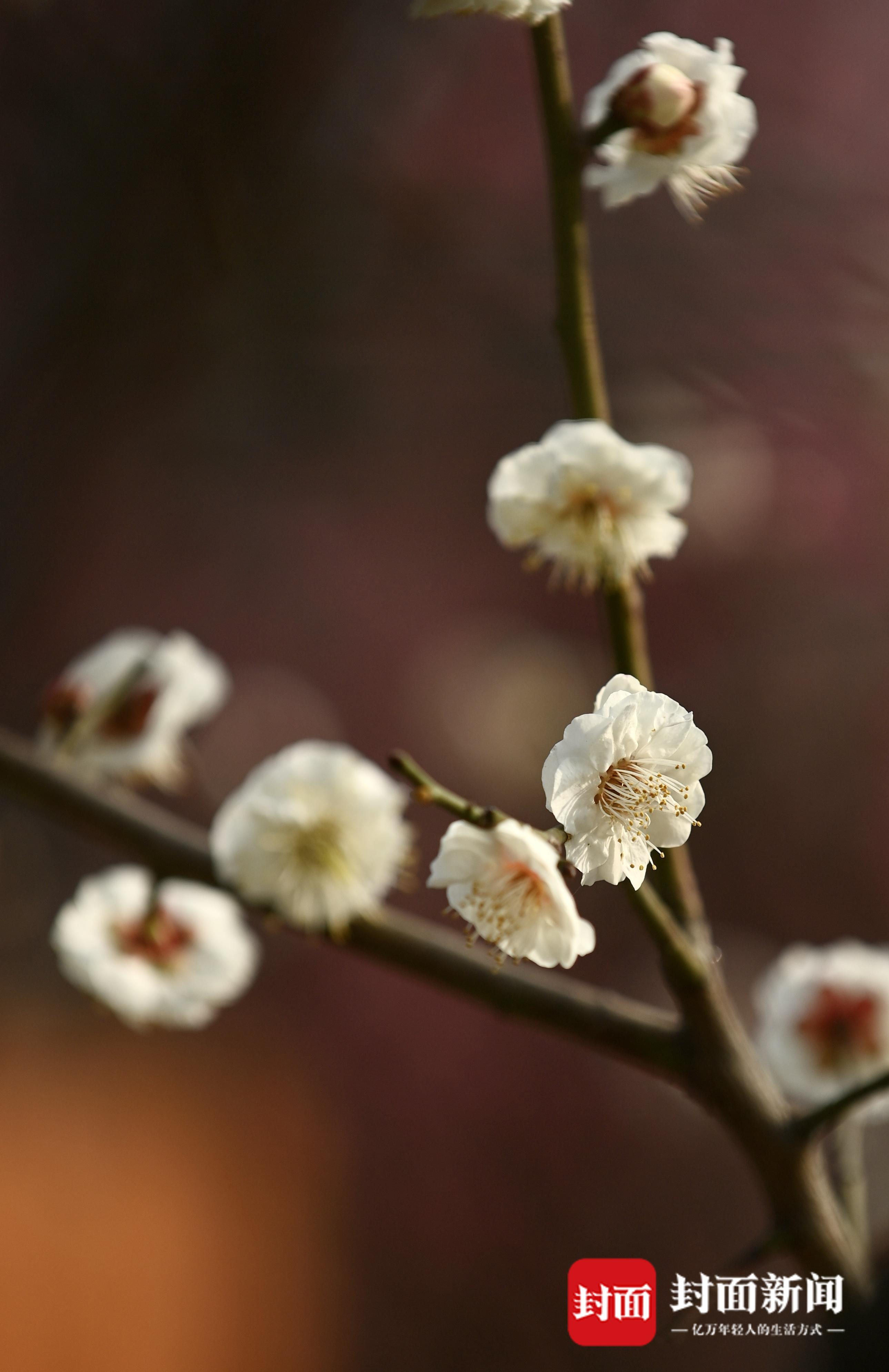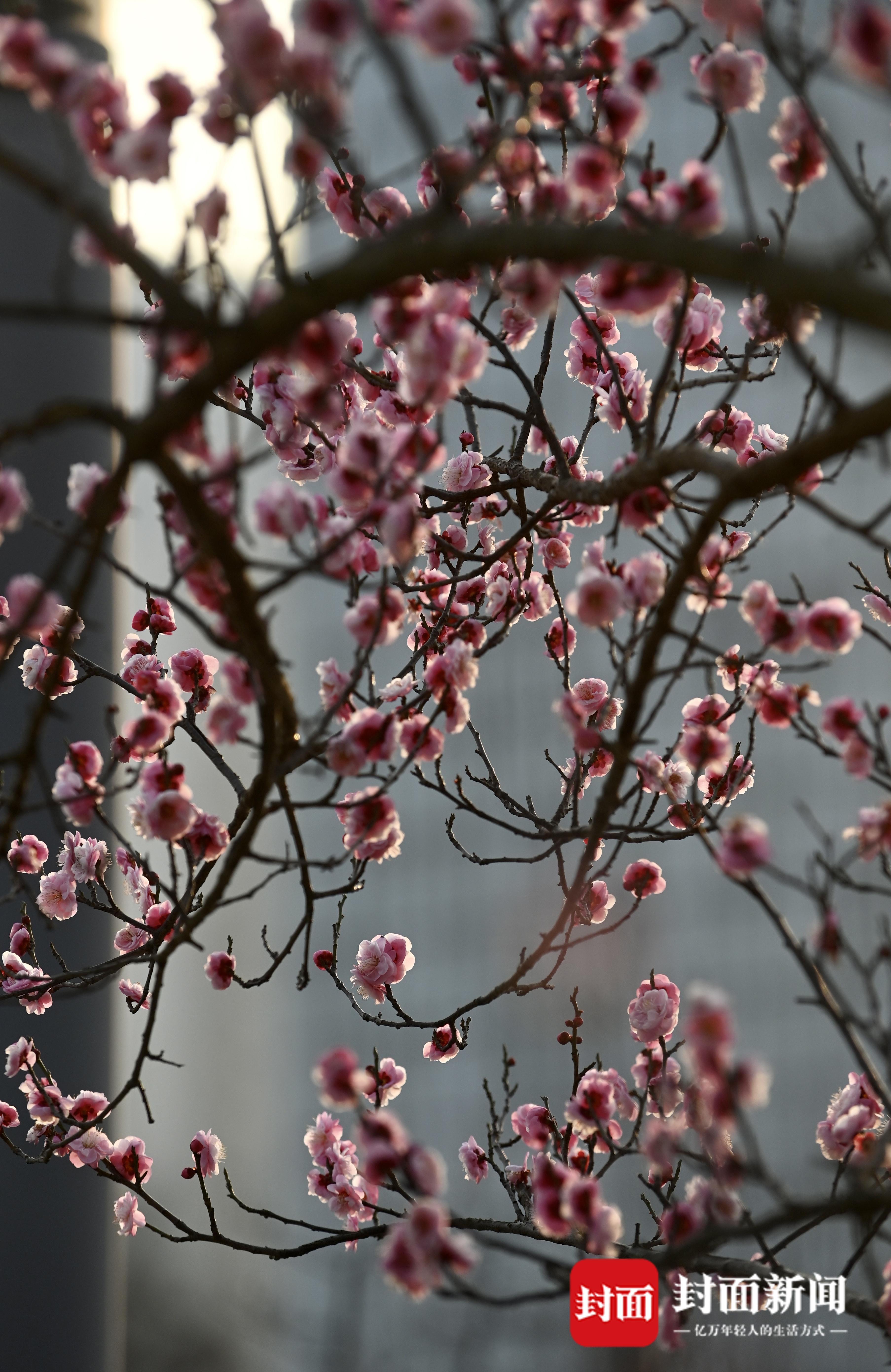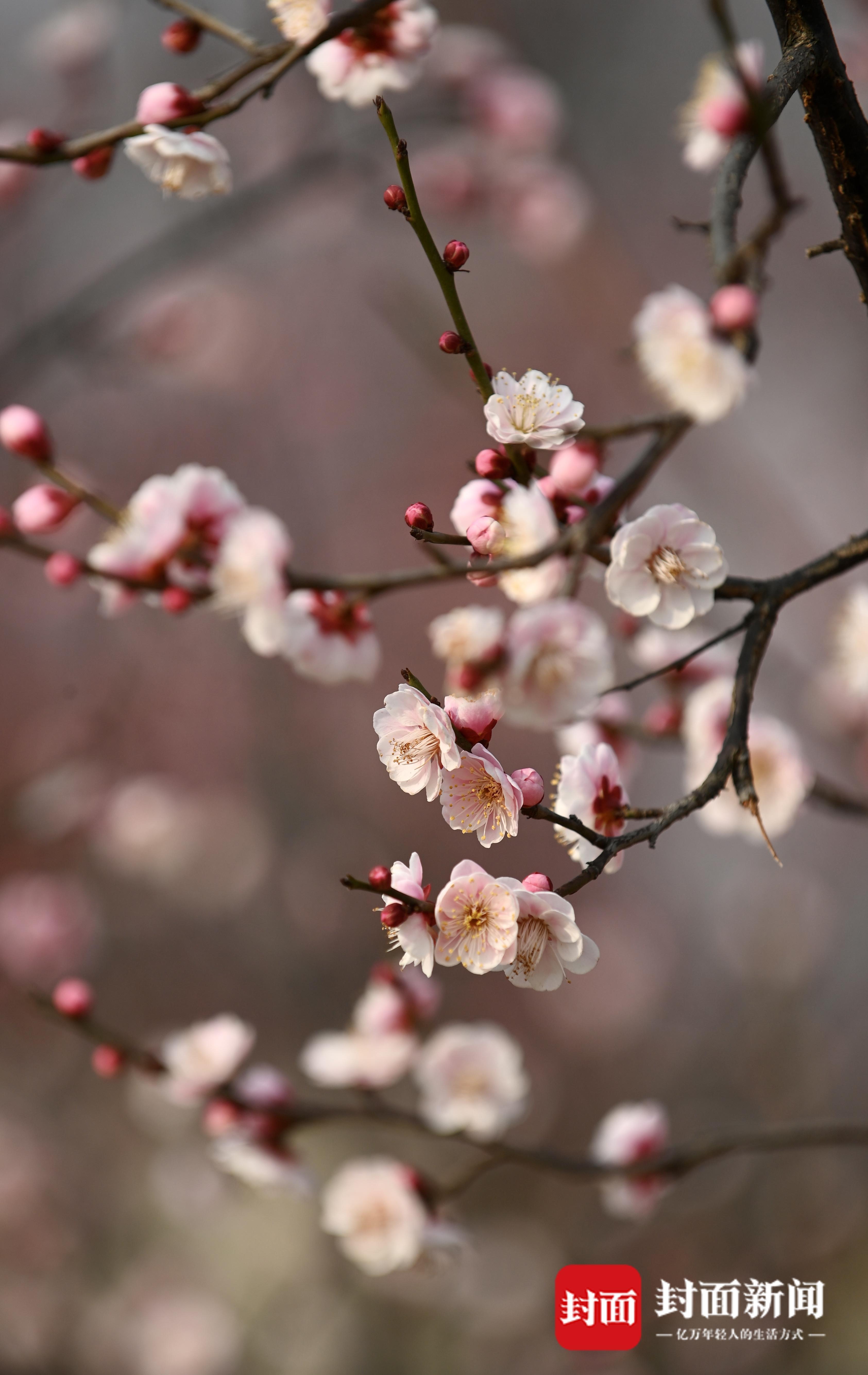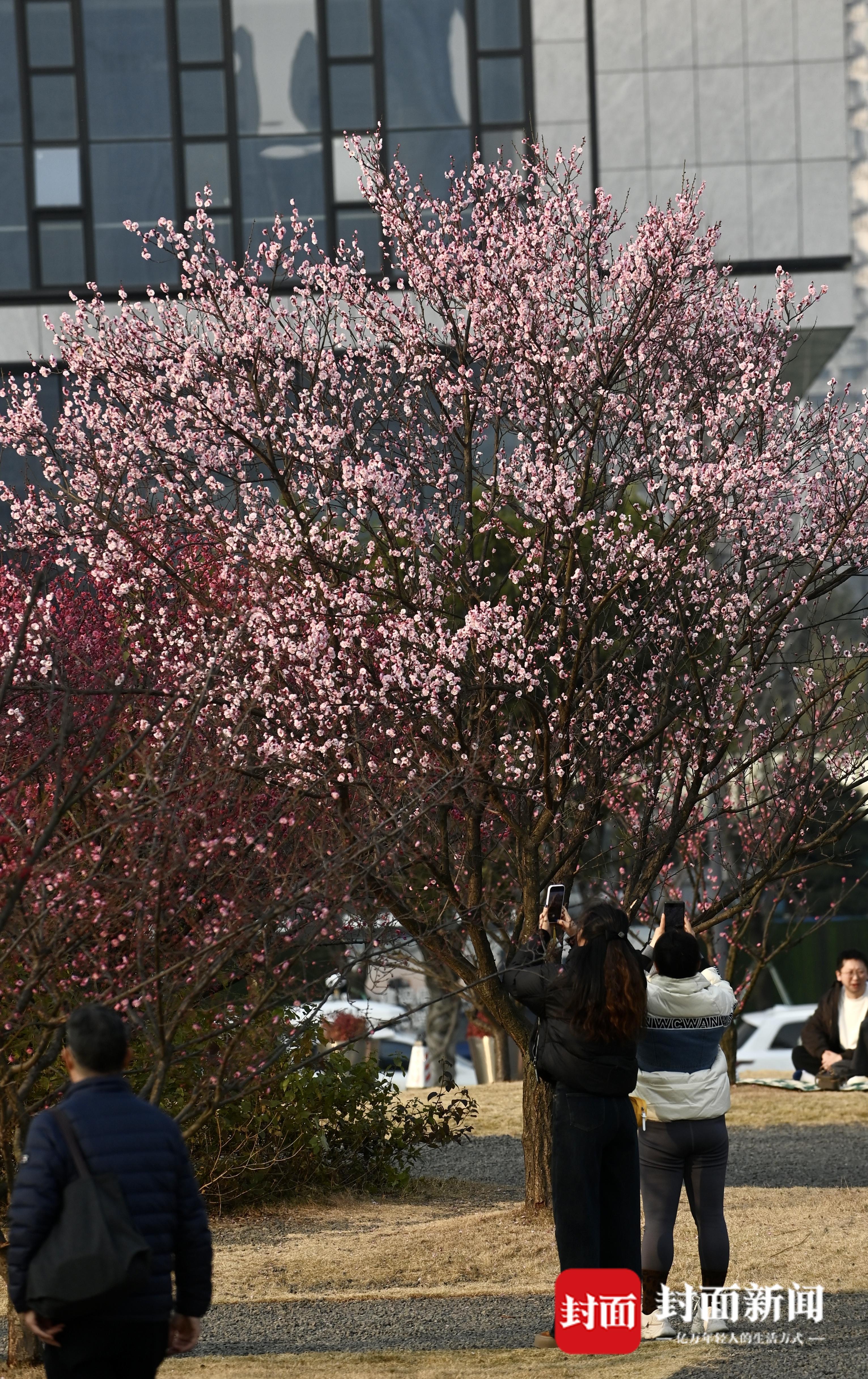 近日,在成都公园,街头第一波梅花已经竞相绽放。在交子公园,以绿白粉红为主的梅花傲立枝头,远远地就能闻到浓郁的花香,市民在花束下席地而坐,或是拍照打卡,感受花重锦官城冬日的惬意时光。