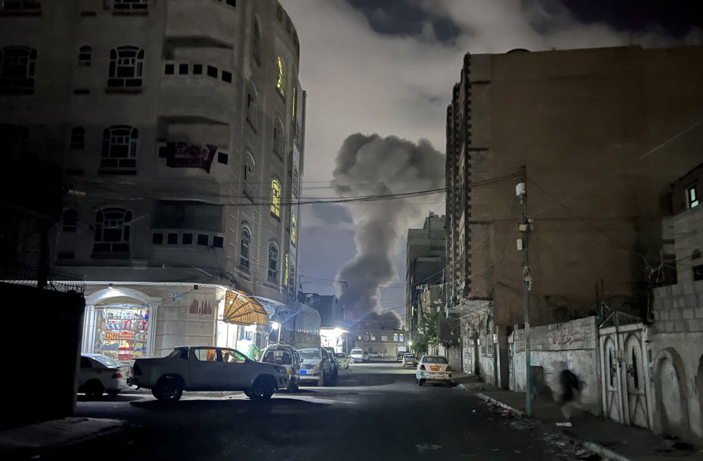 3月19日,也门首都萨那一处地点遭到美军空袭后升起浓烟(手机照片)。新华社发