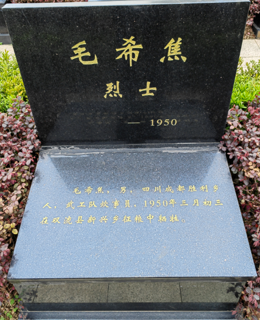 毛希焦,男,四川成都胜利乡人,武工队炊事员,1950年三月初三在双流县新兴乡牺牲,安葬于成都市烈士陵园。