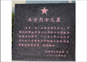 王才,男,山西忻州偏关县人,中国人民解放军第19师副股长,1950年3月9日在金堂县竹篙镇牺牲,安葬于金堂县烈士陵园。