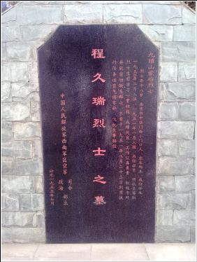程久瑞,男,江苏南京中华门西小门口人,1951年8月23日到京执行任务,返蓉途中气候不好飞机失事,因公牺牲,安葬于成都市武侯区九顶山蒙难烈士陵园。