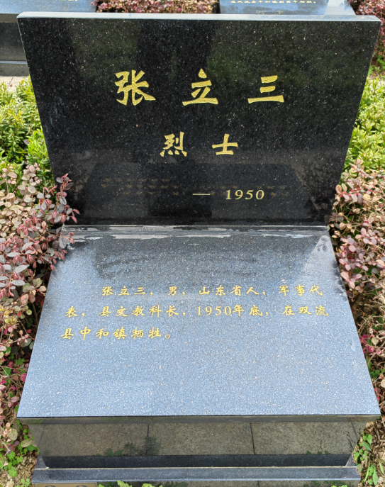 张立三,男,山东省人,军事代表,县文教科长,1950年底,在双流县中和镇牺牲,安葬于成都市烈士陵园。