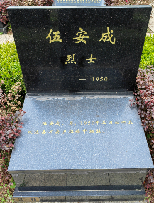 伍安成,男,1950年三月初四在双流县万安乡牺牲,安葬于成都市烈士陵园。