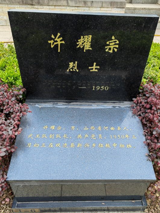 许耀宗,男,山西河曲县人,武工队副队长,共产党员,1950年三月初三在双流县新兴乡牺牲,安葬于成都市烈士陵园。
