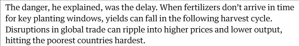 安德烈斯告诉《卫报》,危险在于延误。如果肥料不能在关键的种植时节及时送达,那么在接下来的收获季里产量就会下降。全球贸易的中断可能会导致粮食价格上涨和产量减少,而这种情况对最贫穷的国家影响最为严重。