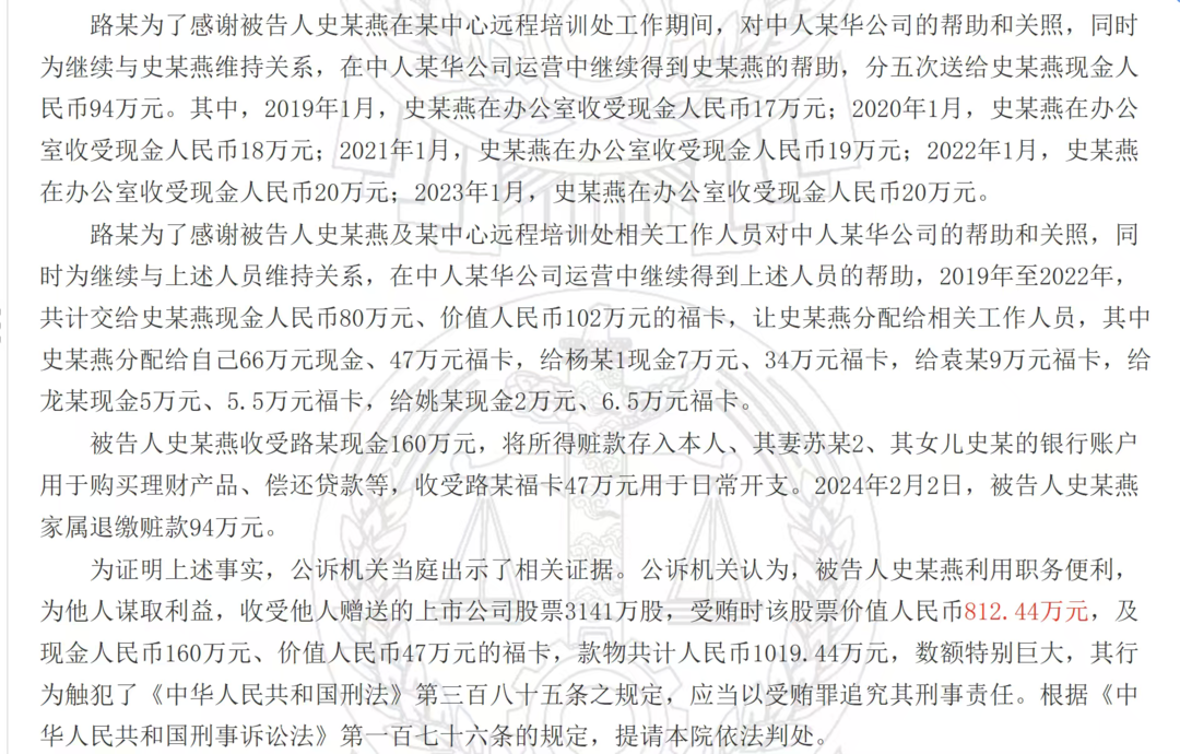 封面新闻记者查询后发现,今年7月,中国裁判文书网发布的一则刑事判决书显示,路某曾向某退休干部赠送价值812.44万元创联控股股票3141万股、现金人民币160万元、价值人民币47万元的福卡等。