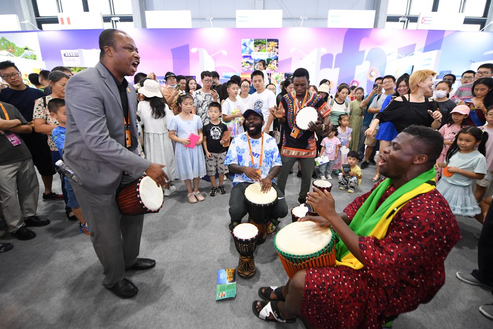 9月2日,在“一带一路”沿线国家特色文化展示活动上,加纳共和国驻华大使馆展区的工作人员在现场即兴表演。新华社记者 鞠焕宗 摄