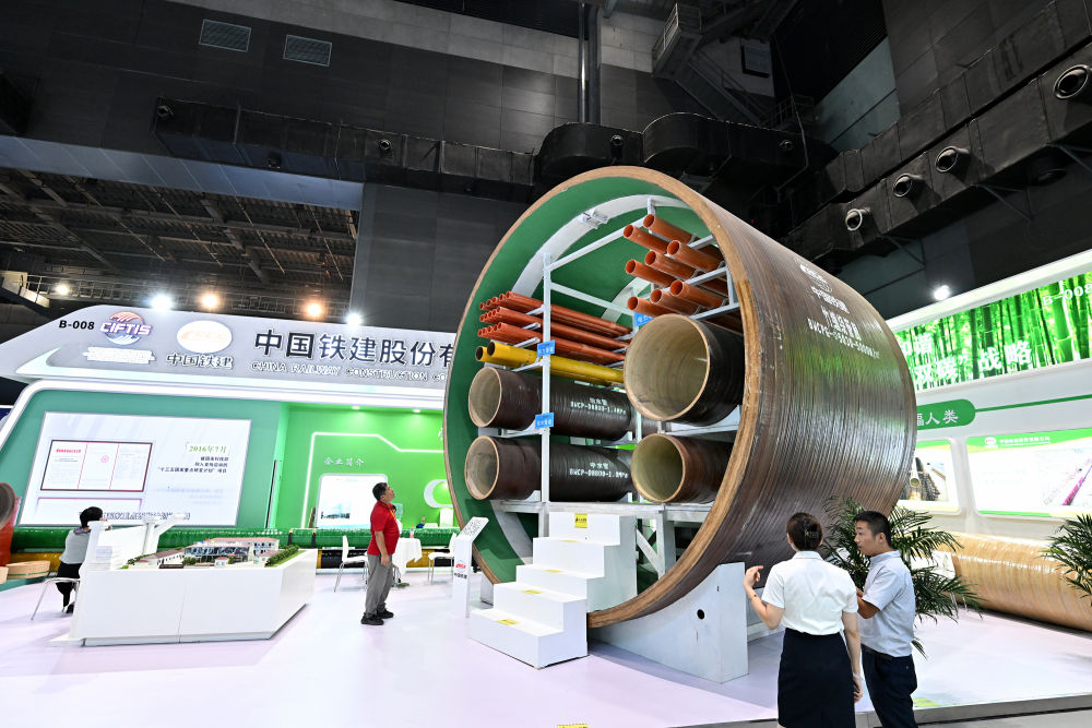9月2日,在国家体育馆举行的服贸会环境服务专题展上,客商在中国铁建展位竹缠绕管廊旁了解信息。新华社记者 李鑫 摄