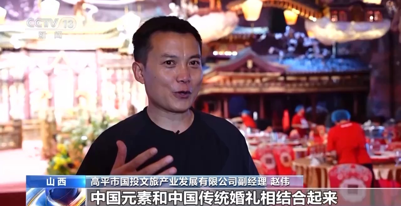 高平市国投文旅产业发展有限公司副经理 赵伟:到了这里亭楼阁榭,龙凤呈祥,中国元素和中国传统婚礼结合起来了。