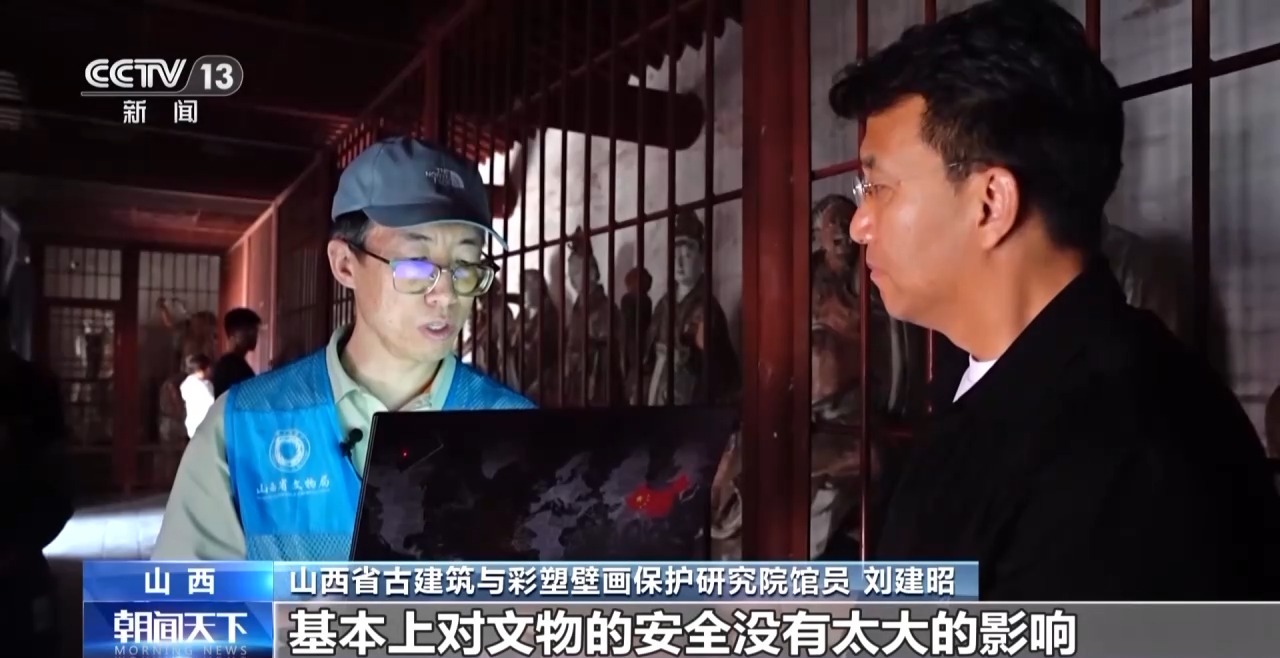 山西省古建筑与彩塑壁画保护研究院馆员 刘建昭:我们在这专门放了一个温湿度跟二氧化碳的检测仪,目前来看温度跟湿度没有受到人流量影响的变化,二氧化碳的浓度小幅增高,过去大概维持在400左右,就是在人流量最高的下午的时候,最高峰能涨到500左右,涨幅大概五分之一,基本上对文物的安全没有太大的影响。