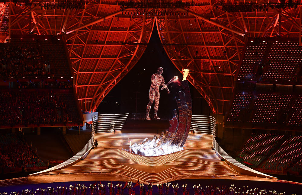 9月23日,最后一棒火炬手汪顺和“数字火炬手”在第19届亚洲运动会开幕式上点燃主火炬。新华社记者 胡虎虎 摄