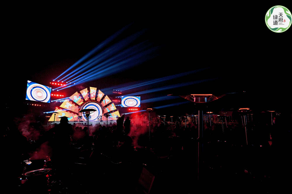 以旭日东升为创意原型的舞台上是热力四射的歌舞,舞台下是欢聚一堂的人群,整片草坪上腾起香浓的雾气,将专属成都的烟火人间染上暖意。