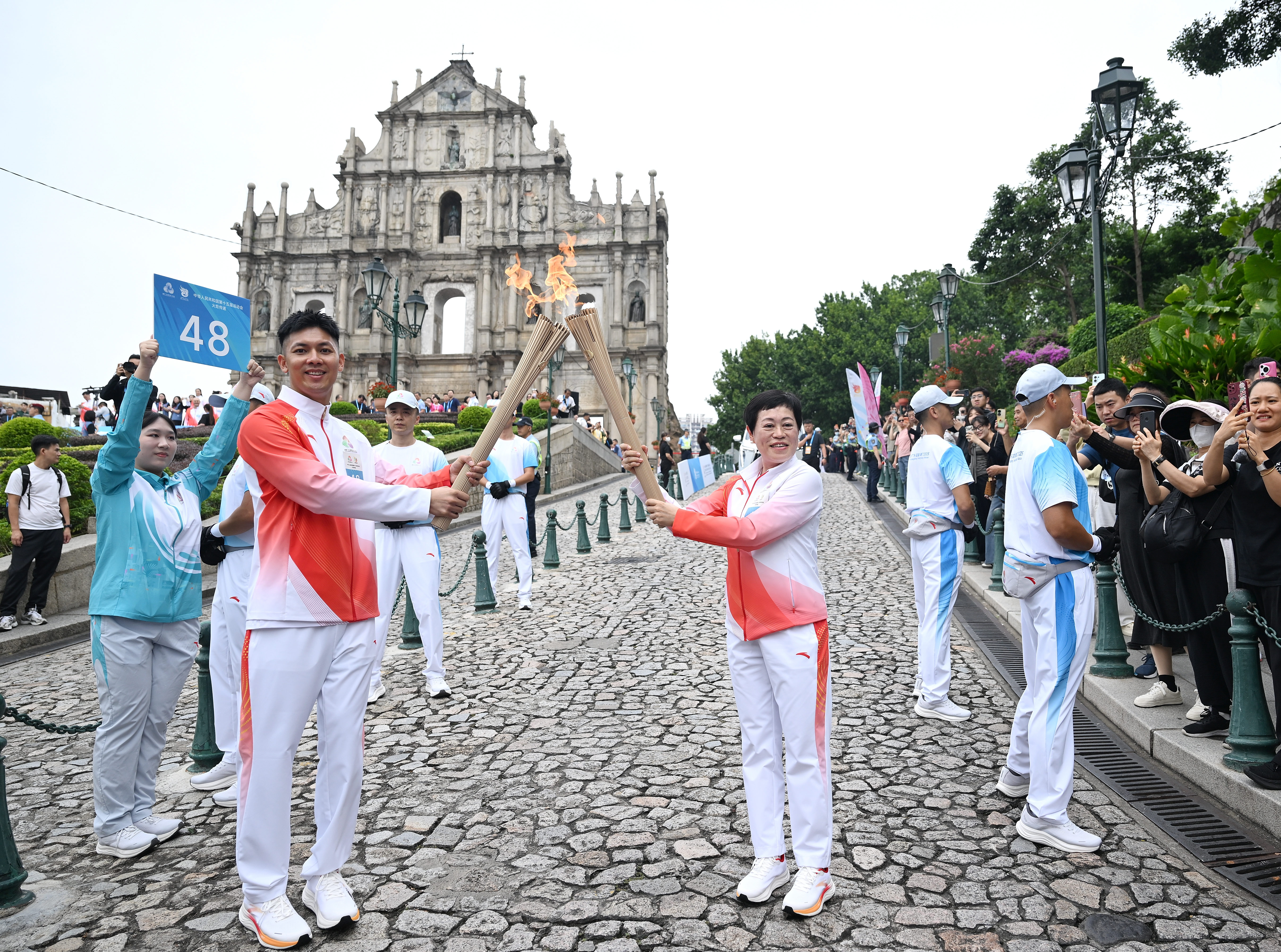↑ 火炬手郭建恒(右)、区海欣在大三巴牌坊前传递火炬。新华社发(张金加摄)