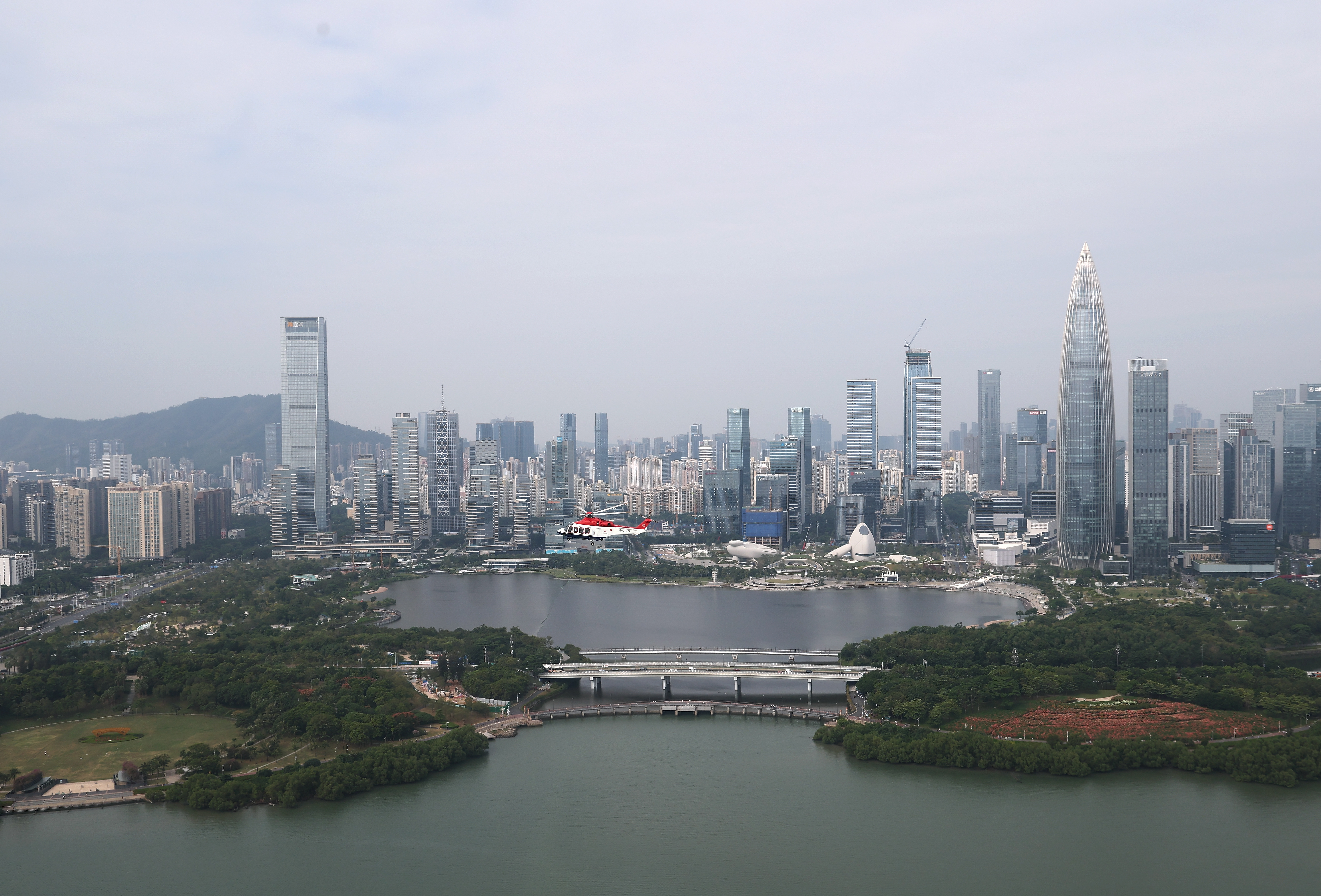 ↑ 搭载圣火的直升机进行空中传递。新华社记者 梁旭 摄