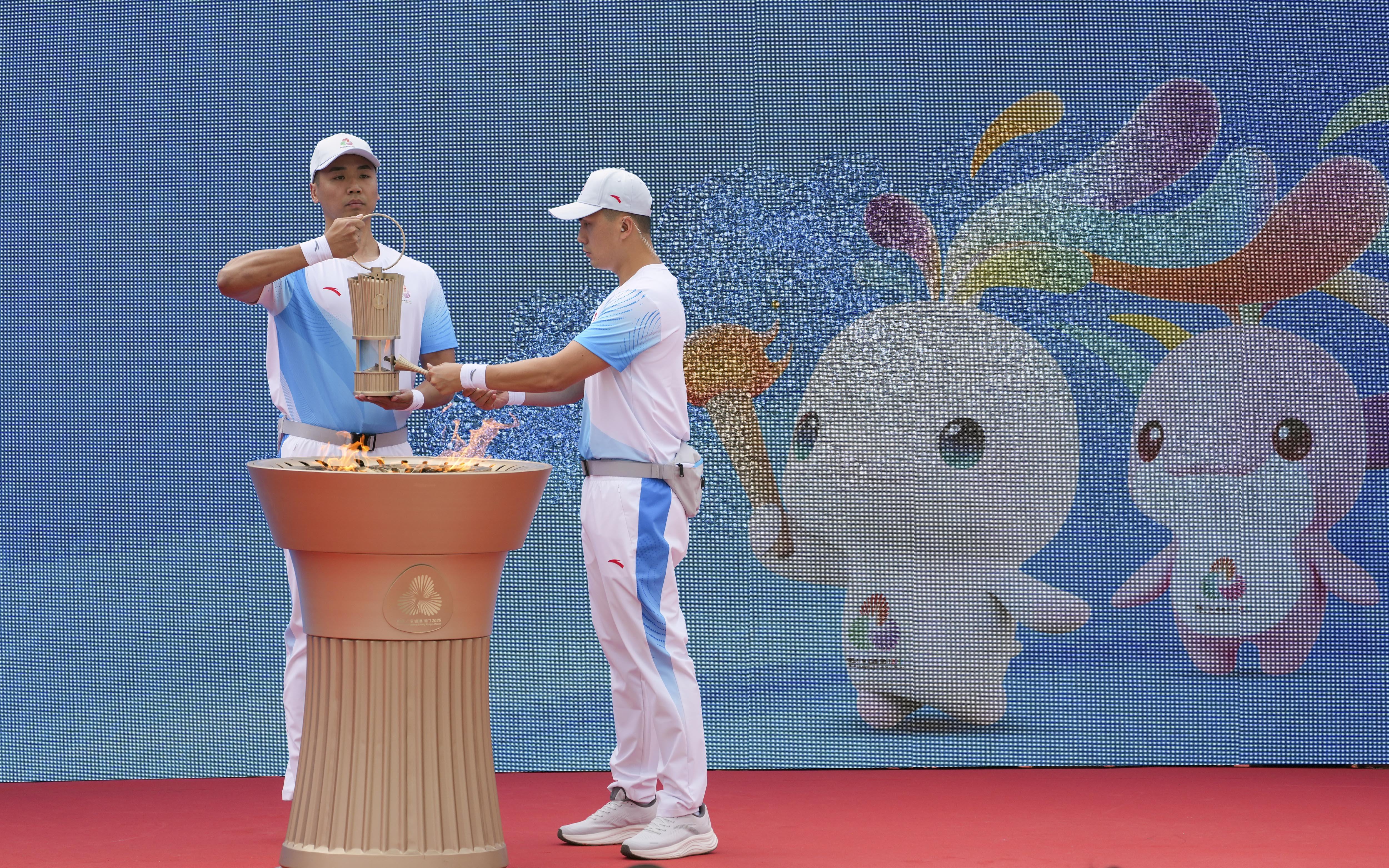 ↑ 火炬手郭建恒点燃圣火盆。新华社记者 胡星宇 摄