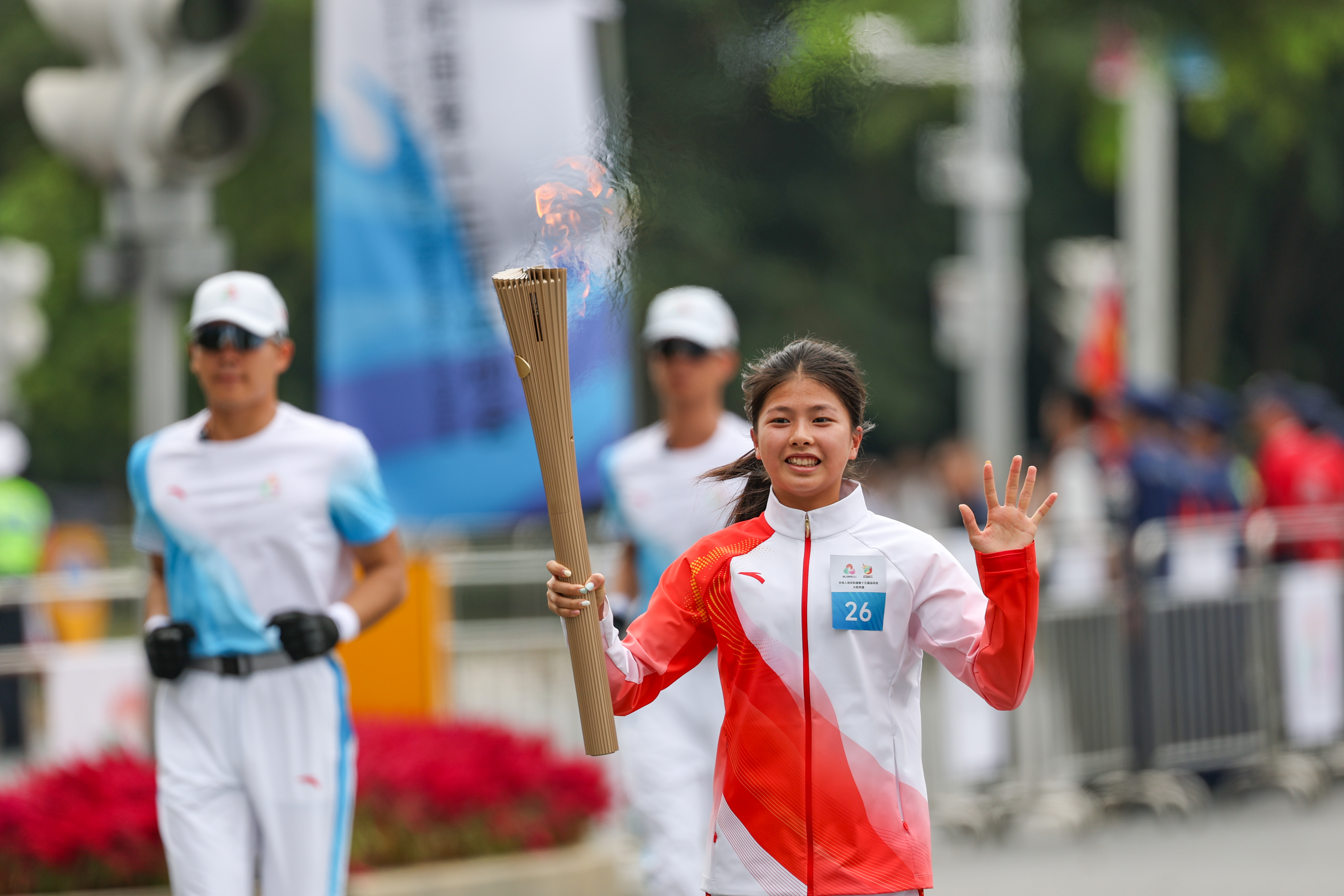 ↑ 火炬手叶欣怡在火炬传递活动中。新华社记者 黄伟 摄