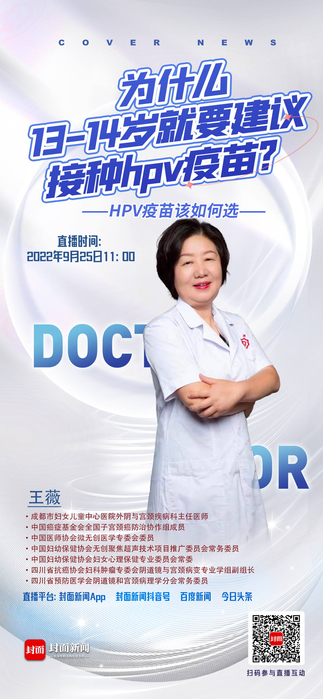 为什么13-14岁就建议接种HPV疫苗?上市的疫苗中有二价、四价、九价,又该如何选择?是目前各大网友和家长最为关心的问题。2022年9月25日上午11点,封面新闻特别邀请了成都市妇女儿童中心医院外阴与宫颈疾病科主任医师王薇,给大家进行权威的解答。届时,封面新闻APP、封面新闻抖音号、百度新闻、今日头条四大平台将同步直播,可点击如下链接预约直播: