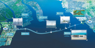 一条集“桥、岛、隧、水下互通”于一体的超大型跨海通道,宛若长龙,呈“S”形穿云破海,时隐时现。
