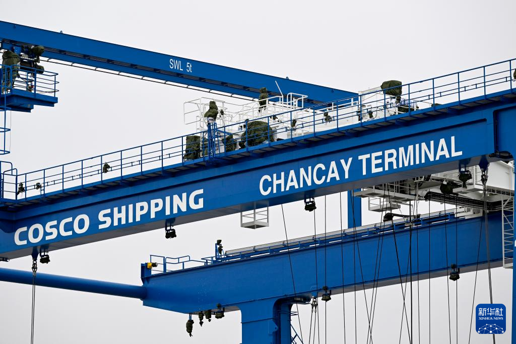 这是6月21日在秘鲁钱凯港拍摄的印有“中远海运,钱凯码头”字样的轨道吊。 新华社记者 李木子 摄