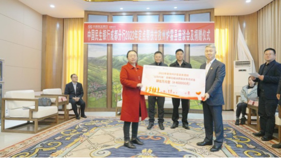 座谈会上,县政府与民生银行成都分行、中自环保股份有限公司、海诺尔环保产业股份有限公司举行了捐赠仪式,捐赠项目包括青稞花糖消费帮扶专项资金40万元、2022年“欧石楠民生奖学金”项目30万元、中自环保“民生爱心资金”项目20万元及中自环保公司新研发的应急供电设备1套、海诺尔环保“民生爱心资金”项目20万元。