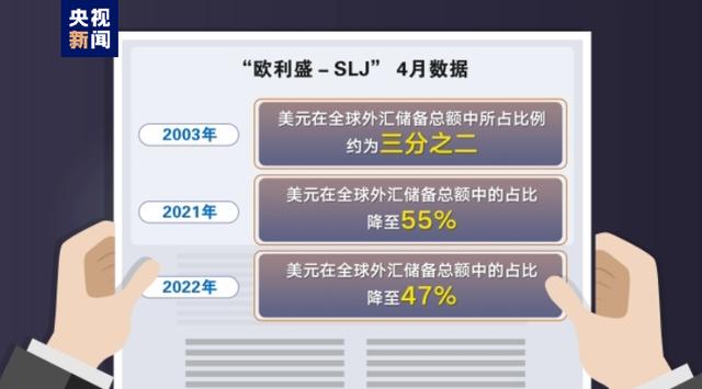 根据全球知名资产管理公司“欧利盛-SLJ”4月发布的数据,美元作为全球首选储备货币的地位在2022年急剧下滑。2003年,美元在全球外汇储备总额中所占的比例约为三分之二,到2021年占比降至55%,而去年进一步降至47%。