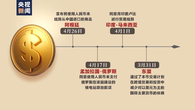 4月26日,阿根廷宣布将停止使用美元、转而使用人民币结算从中国进口的商品;4月17日,孟加拉国和俄罗斯商定同意使用人民币支付俄罗斯在该国建设的核电站项目款项;4月1日,印度宣布,和马来西亚之间的贸易可用印度卢比结算;3月31日,东盟通过了本币交易计划,加强本地货币使用,并在跨境贸易和投资中减少对以美元为主的国际主要货币的依赖。