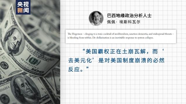 巴西地缘政治分析人士佩佩·埃斯科瓦尔近日发文直言,《“去美元化”进程切入“高速档”》。文章写道,“现在已经确定,美元作为全球储备货币的地位正在削弱。”文章还指出,“美国霸权正在土崩瓦解,而‘去美元化’是对美国制度崩溃的必然反应。”