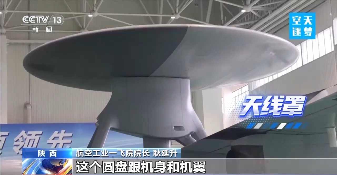 我们看到它有一个大大的圆盘,实际上它是一个预警天线的天线罩,这个圆盘跟机身和机翼这样的大部件相比,显得比例比较大,因为主要是我们要达到比较大的探测距离,这么一个大的圆盘在这个小吨位的飞机上面已经做到了极限。