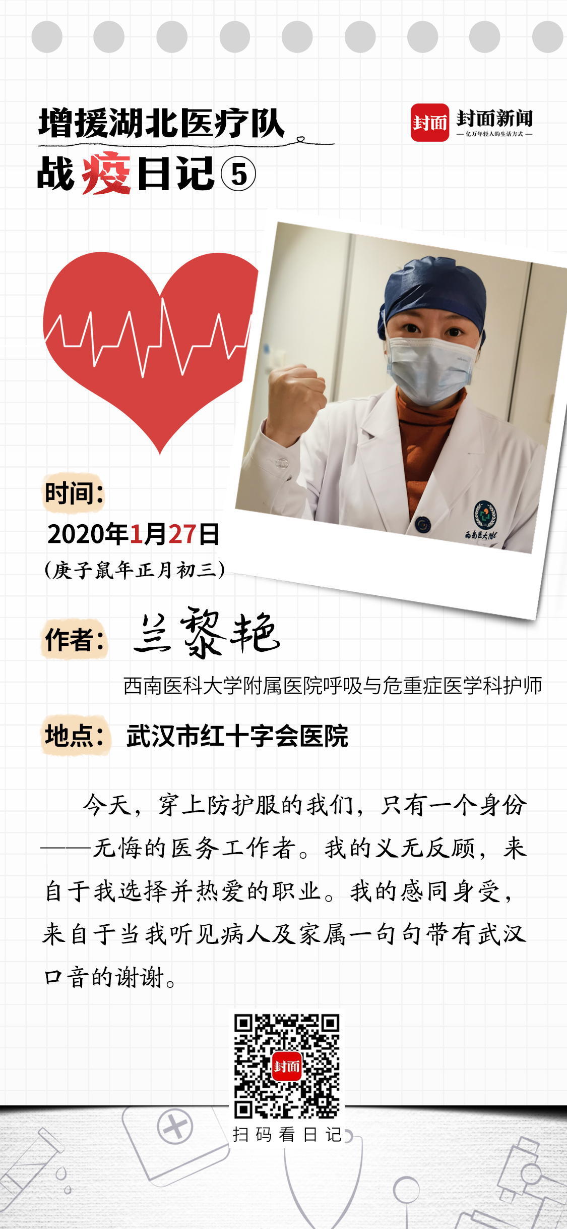今天一早,开始了在呼吸七病区的护理工作,穿上防护服的我们,只有一个身份-无悔的医务工作者,我的义无反顾来自于我选择并热爱的职业,我的感同身受来自于当我听见病人及家属一句句带有武汉口音的谢谢。人是渺小的,但是我们有一个共同的家,中国,武汉是我们的家人,家人有难,八方来援,风雨终会过去。看到一同抗战在一线的医务工作者,克服穿戴隔离服的所有不适,冒着被感染的危险,我只想用自己的全部精力和专业知识和技术为他们减轻病痛,希望她们能尽快走出疾病阴霾,迎来阳光。