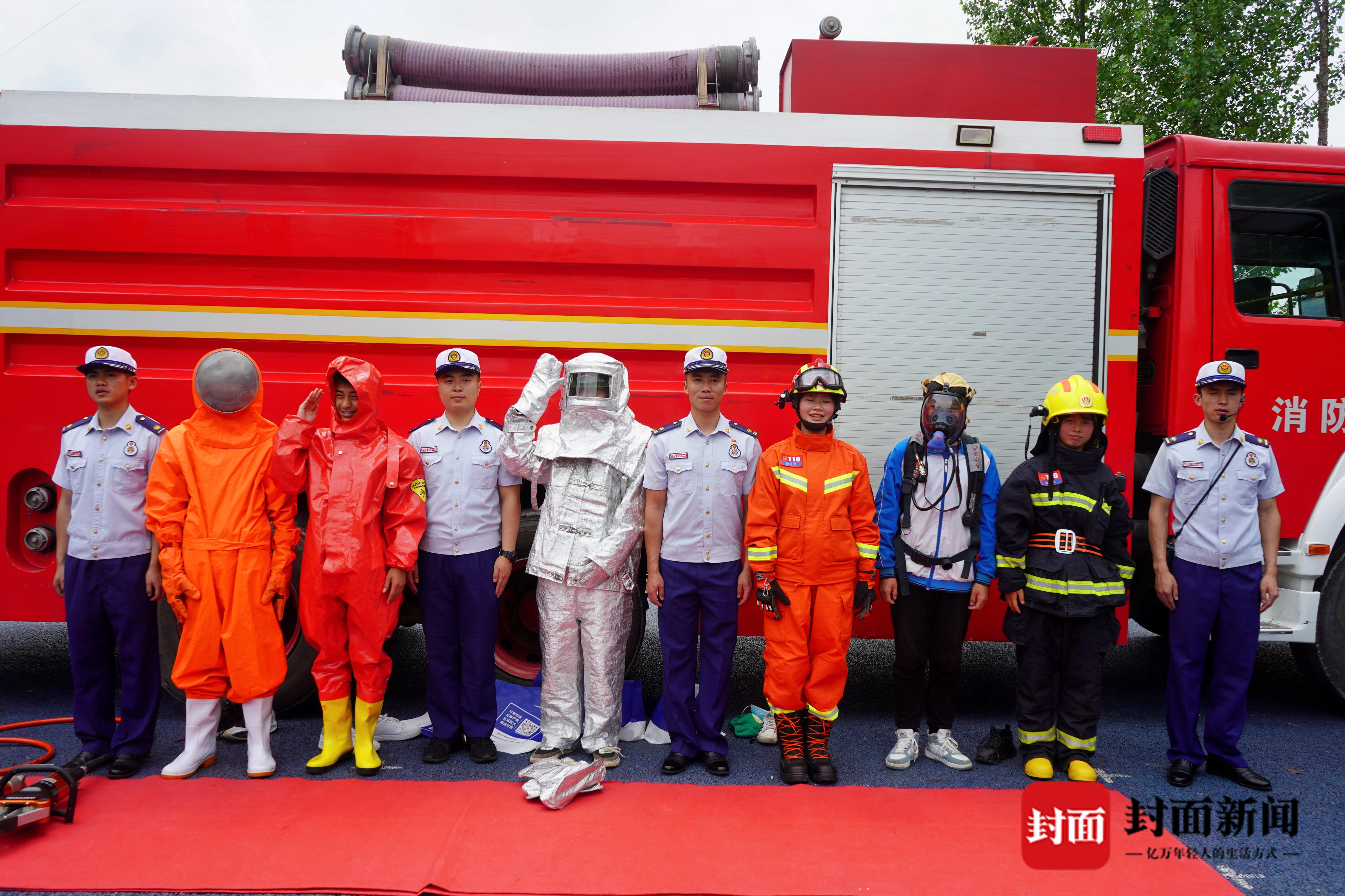在活动现场,情景模拟火情,指导体验人员利用灭火器进行实战演练。随后,消防员还向全体人员展示了消防救援车辆、器材装备及消防产品,介绍了车辆、装备、产品的名称和用途,并现场进行了操作实验。
