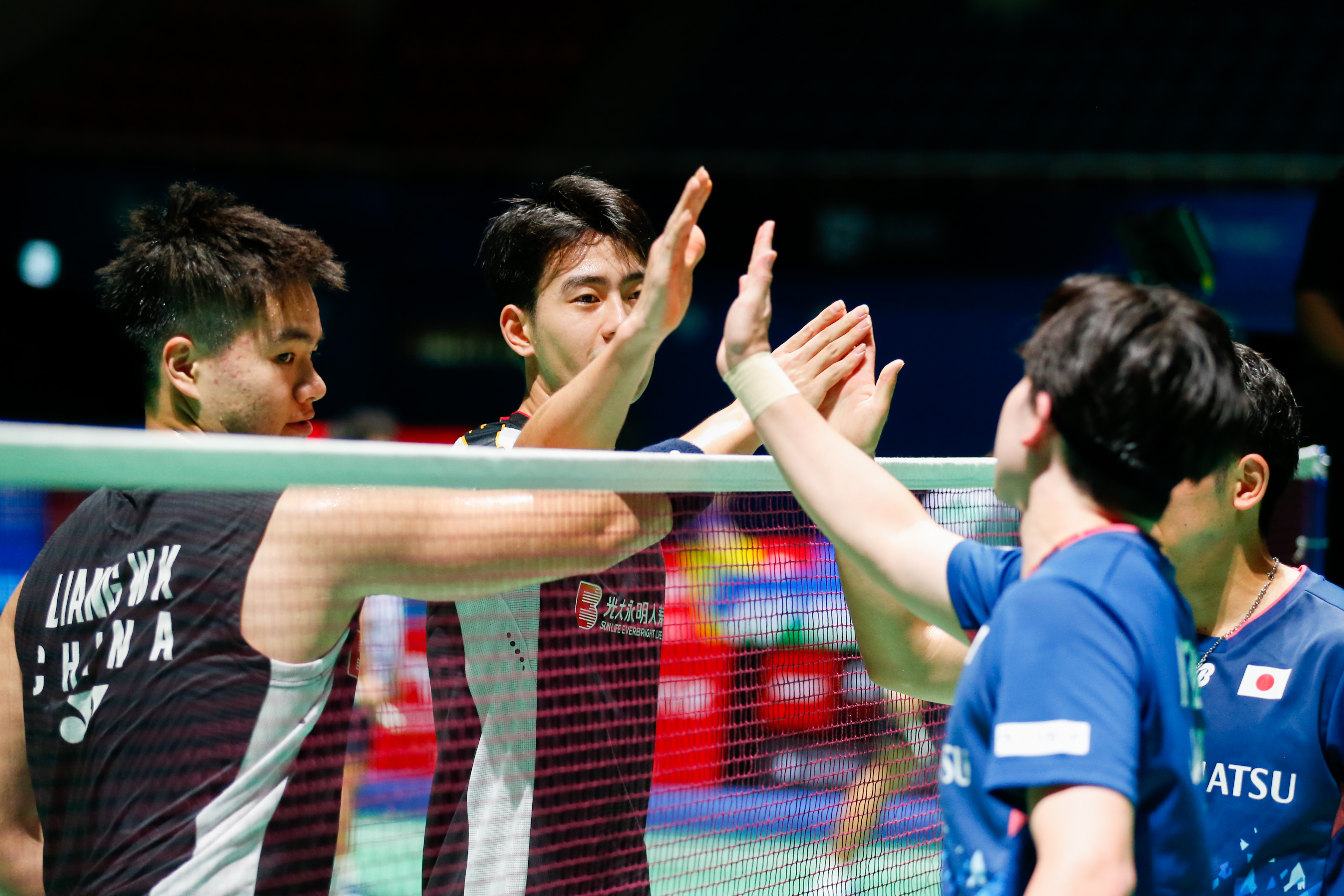 7月18日,梁伟铿(左一)/王昶赛后与日本队选手击掌。新华社记者 王益亮 摄