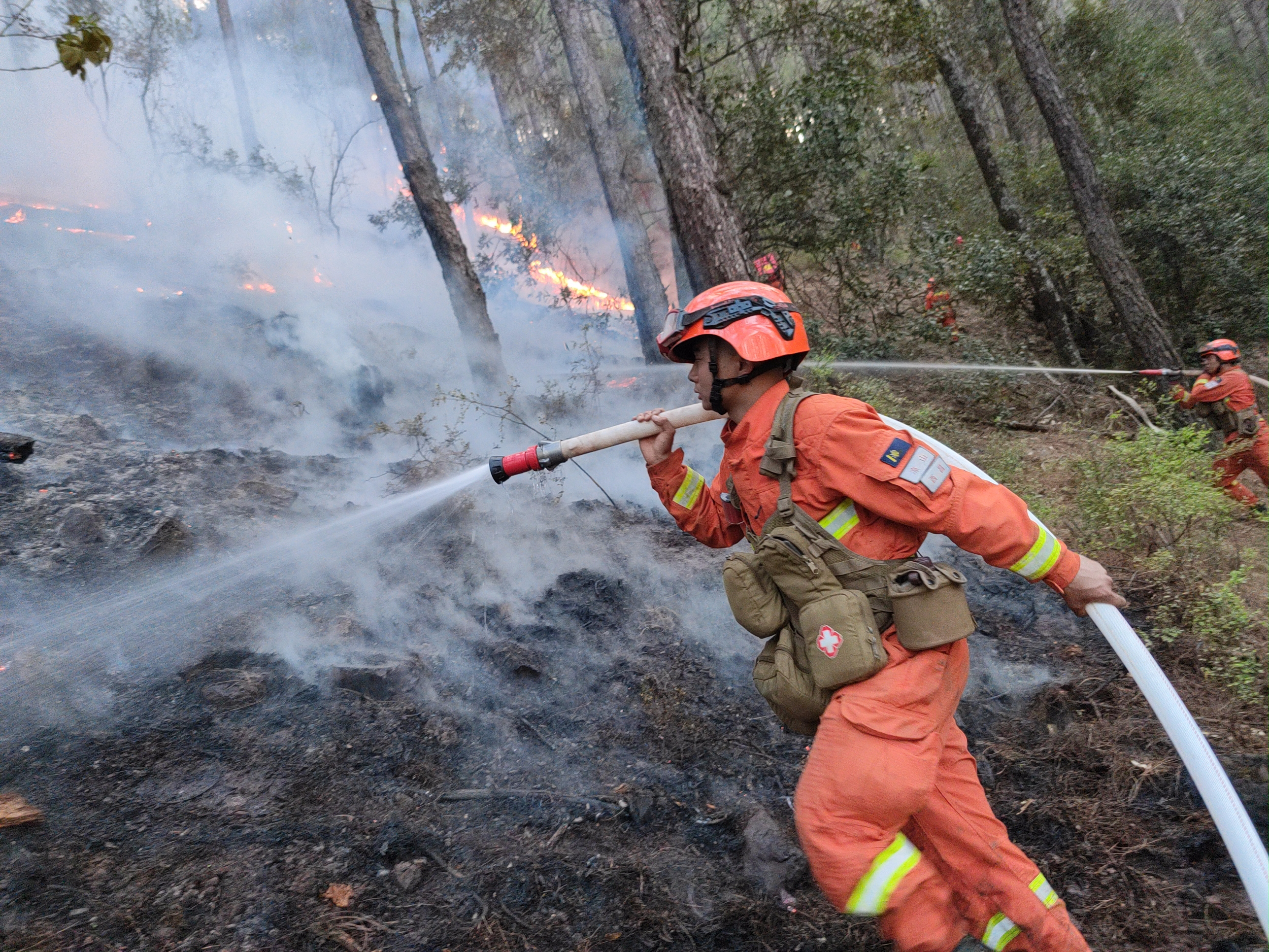 针对火场平均海拔2200米,坡度约40~60°,植被以云南松和杂灌为主。火场东线为稳进地表火伴间歇性树冠火的连续火线,北线、南线为稳进地表火的连续火线,西线有约1.5公里断续火线的特点,火场联指命令凉山州消防救援支队53人10车为火灾扑救进行输水供水,凉山森林消防支队西昌大队、直属大队154人带西昌市专业扑火队110人,重兵投入火场西线,在南线中段架设水泵打开突破口,一路沿火线向东扑打,一路沿火线向西扑打。