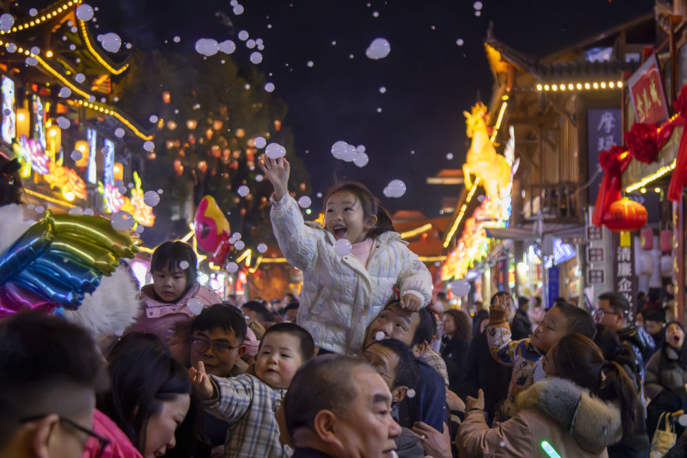 在湖北恩施,土家女儿城的夜晚被璀璨灯火点亮。新春非遗秀轮番上演,层层围观的游客不时举起手机,跟着节奏轻轻摇摆。