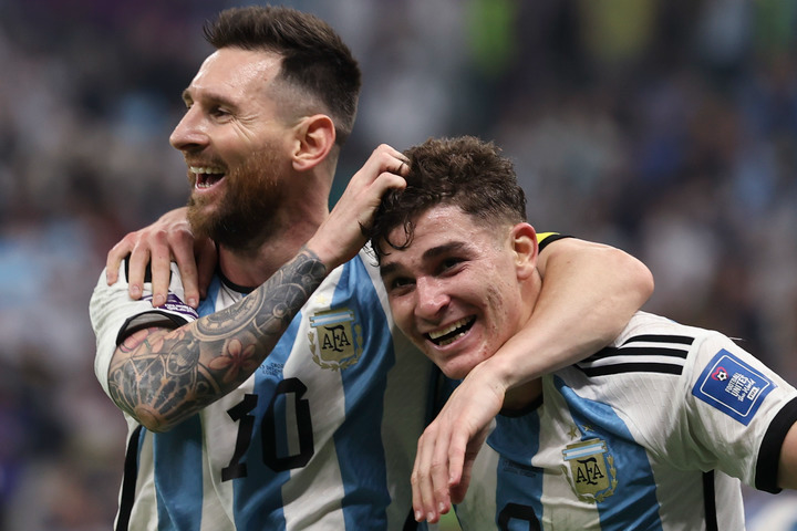 12月13日,阿根廷队球员阿尔瓦雷斯(右)在比赛中进球后与队友梅西庆祝。新华社记者 徐子鉴 摄