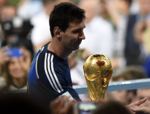 2014年7月13日,阿根廷队球员梅西在颁奖仪式前从大力神杯前走过。新华社记者 吕小炜 摄