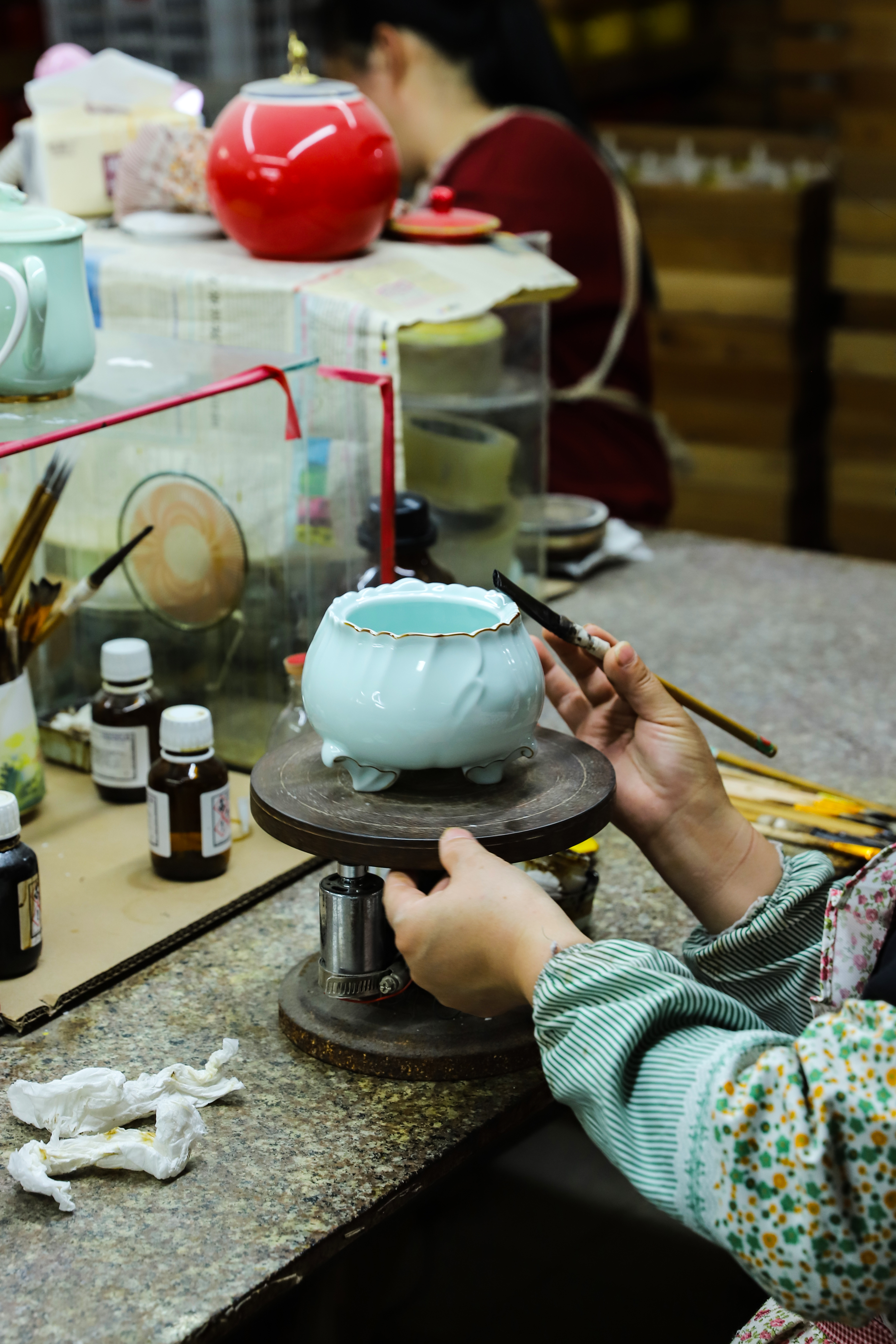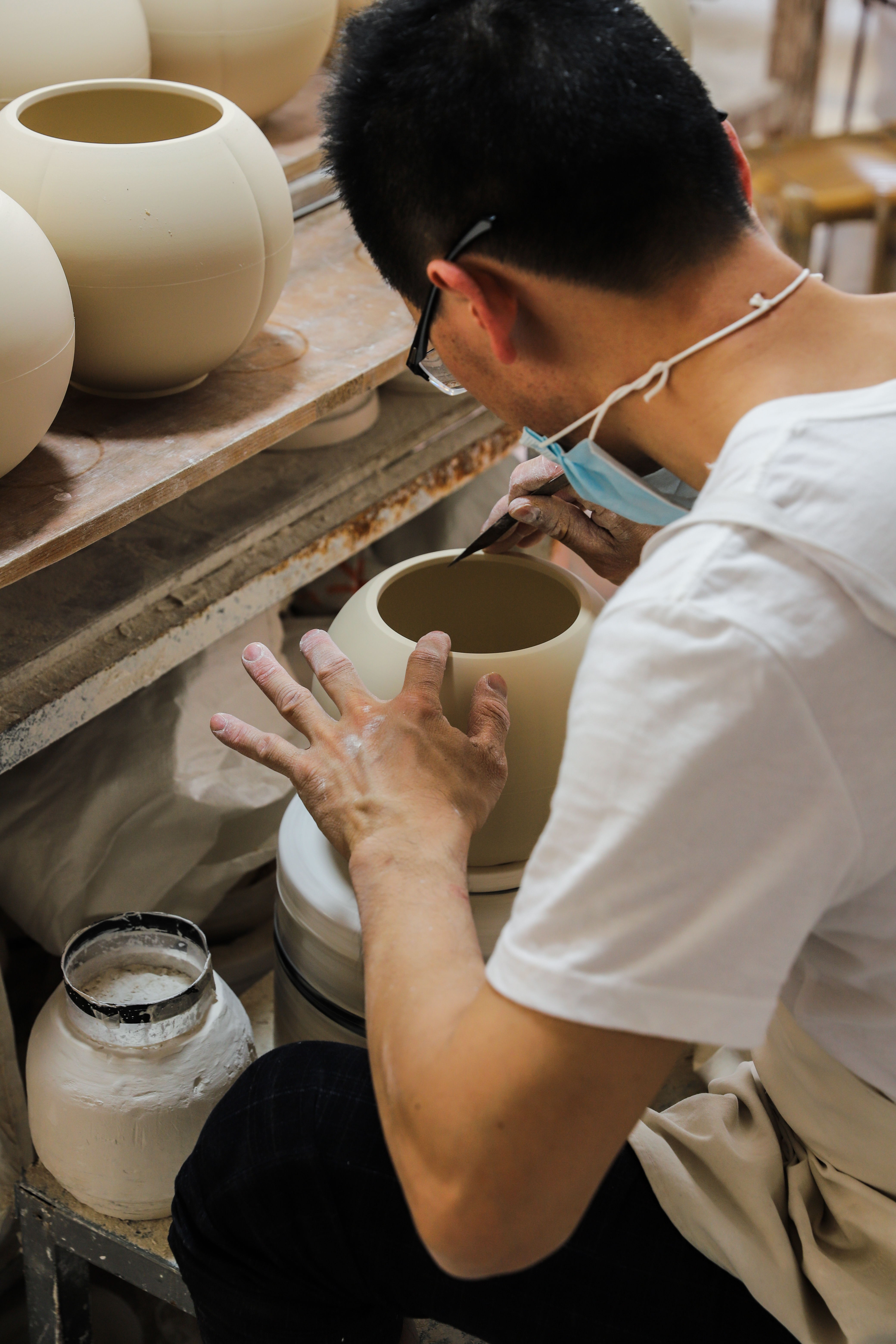 谢锦华:对。像这种限量的产品,很花时间,很烧脑。每一款产品从设计到研发到最终的成品出来,最少都要经过八十几道工序,一个人是没办法全部完成的。它不像古代陶瓷,手拉坯做好再印上图案就可以进入窑炉烧制了。现代陶瓷工艺的工序远远超出以前太多了。从完美器型的设计创作,泥料的研制,到烧成温度的调试,几款高温釉色的结合.......都要攻克很多道技术难题。不管是设计师还是工艺师,对每道工序基本上都懂、都能操作、都了解的,不多。