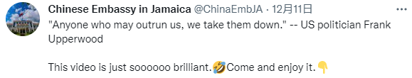 中国驻牙买加大使馆账号推荐片中“不管是谁,只要有点赶超我们的势头,我们都要把它摁趴下”的台词,并评论道:“这个片子太太太赞了!快来看看吧。”