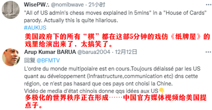 近日,新华社网红工作室戏仿曾红极一时的美剧《纸牌屋》制作英文微电影《扯牌屋·谁最心机》,在海内外引发热烈反响,众多官员、学者、媒体人下场互动。其中,一些来自美国的反应尤为显眼。对此,用一个网友的话来形容:一些美国人真坐不住了!