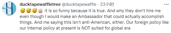 一名美国网友指出:“很有意思,因为(影片)说了大实话……这部影片并非在反美。我们现在的外交政策和国内政策一样,并不适应全球化时代。”