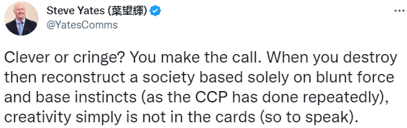 曾任美国反华喉舌——“自由亚洲电台”总裁、美前副总统切尼副国家安全顾问的叶望辉评论称:“当你通过强力破坏并重建社会(正如中国共产党一贯做的那样)时,你就谈不上有创意。”