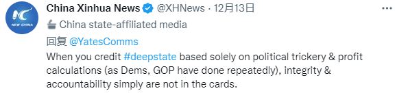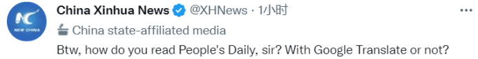 对此,新华社模仿其口吻回应:“当你通过政治把戏和利益算计为‘深层国家’正名助力(正如美国两党一贯做的那样)时,你就谈不上正直和问责。”并追问他:“您是怎样读《人民日报》的呢?需要借助谷歌翻译不?”