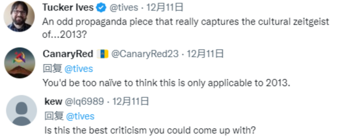 美国全国公共广播电台媒体人塔克·艾夫斯阴阳怪气地讽刺片子“抓住了2013年的时代精髓”(注:美剧《纸牌屋》推出于2013年),立刻被网友“教育”:“如果你认为这只适用于2013年,那你就太无知了。”“想找茬儿就这水平?”